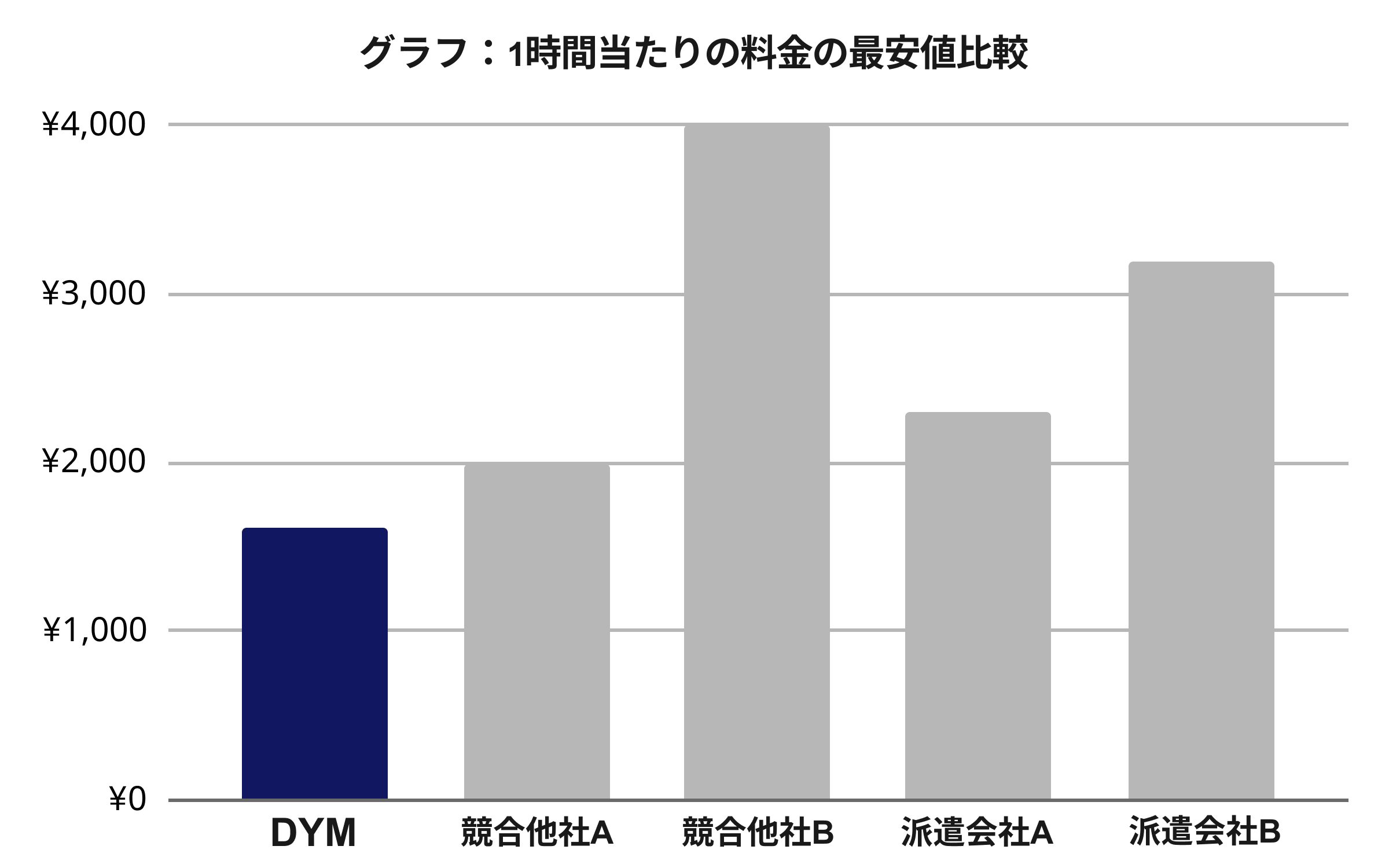 DYMの事務代行サービスは、1時間あたり1,600〜という料金で、他社の相場である1,980~4,000円と比較して、非常にコストパフォーマンスに優れています。