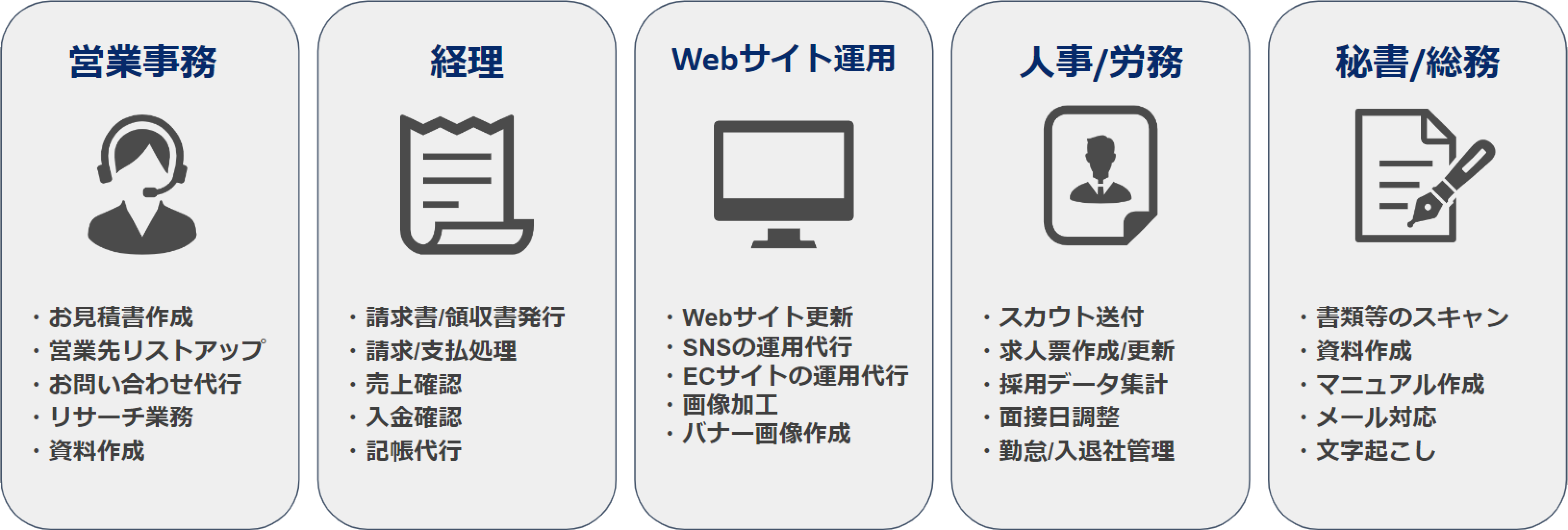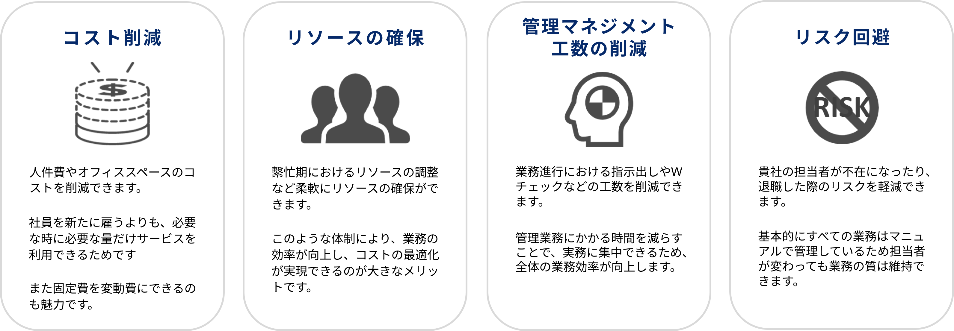 また、人材派遣や契約社員を雇用するよりも、コストを削減しつつ業務の外注ができるため、費用面での負担を軽減できます。