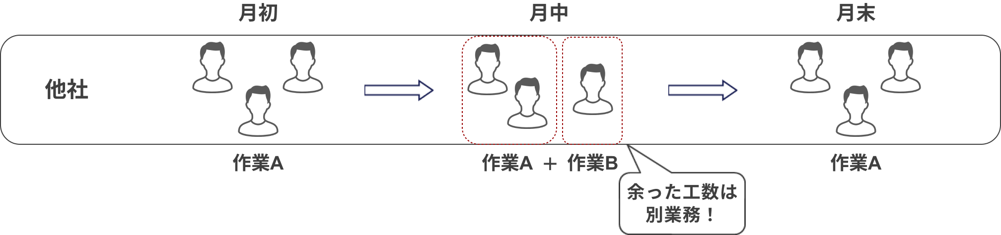 - 経理業務など繁忙期が明確な業務に対応する場合、業務が集中する月初や月末に合わせて稼働人数を3名に増やし、他の期間は1名にするなど、柔軟なリソース調整が可能です。これにより、企業様のニーズに応じた効率的な業務運営が実現します。