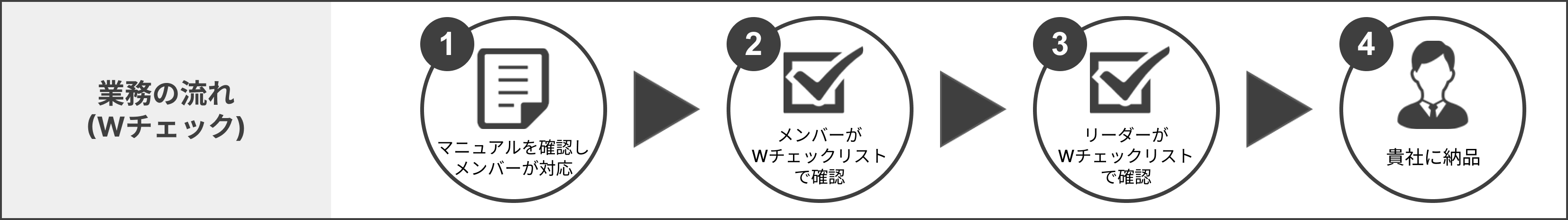 - 業務完了後、2名のスタッフによるWチェック体制を導入し、ミスの発見率を高めます。この仕組みにより、精度の高い成果物を提供します。