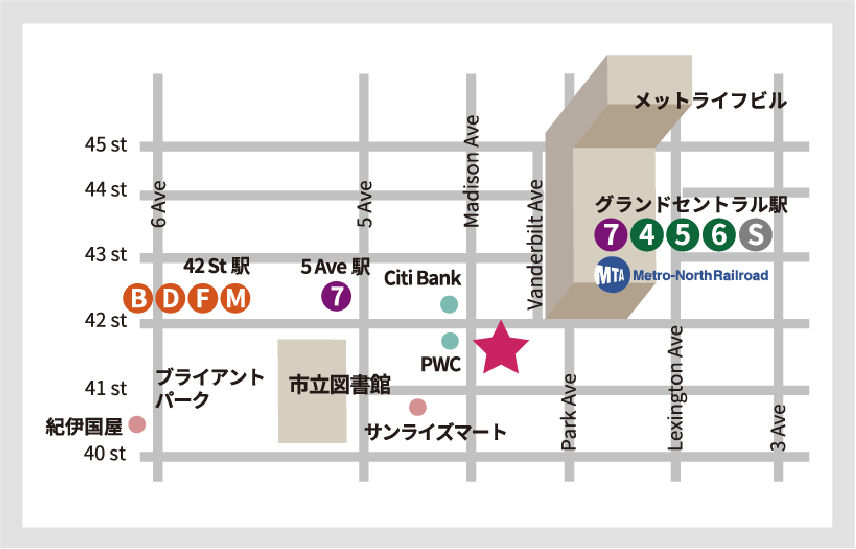 ➁当院から最寄りのグランドセントラル駅出口です。42nd StとVanderbilt Ave交差点付近、グランドセントラル駅南西の角です。