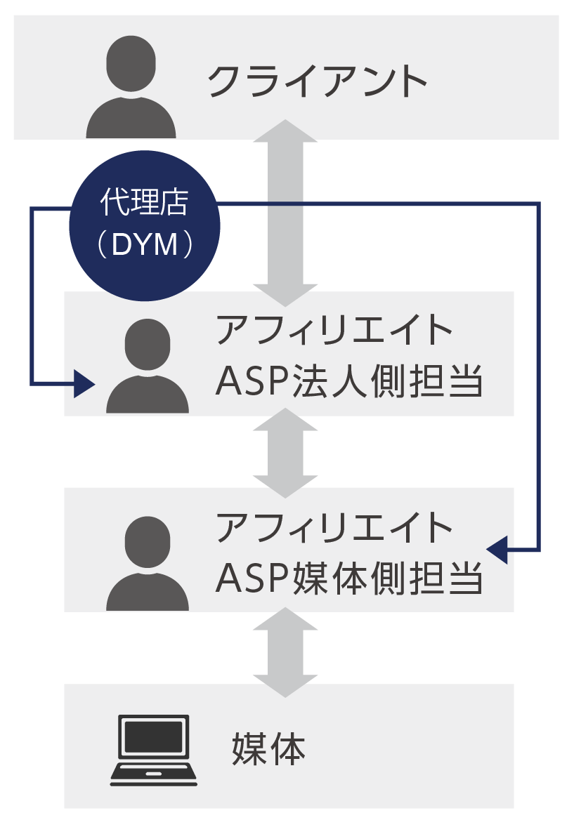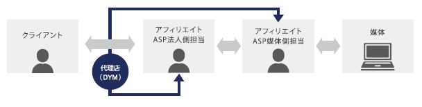 Services 事業内容 Affiliate advertisement アフィリエイト アフィリエイトとは成果報酬型広告のことです。クリック広告等と違い、成果が発生しない限り費用は発生しません。インターネット広告及び、すべての広告手法において最も費用対効果の高い広告手法です。当社では200 社以上の運用実績がございます。 成果報酬型の広告 世界中の広告で最も費用対効果が良いと言われており、クリック広告等とは異なり、成果が発生しない限り報酬をお支払い頂きません。 ASPの組み合わせが必要なケースも 安定した広告配信を長期間行うためには、多くのASPに一括して登録していることが重要です。DYMは面倒な一括管理・運営をお手伝い致します。 リアルタイムの分析とマーケティング リアルタイム及び過去に渡って成果情報、アクセス状況を確認できるため詳細なマーケティングデータの分析が可能です STRONG POINT 運用の最適化 各ASP の法人担当・媒体担当双方との強いコネクションにより運用の最適化が可能です。 アフィリエイト広告=費用対効果は高いですが、管理がとても大変です。DYMを通すことで、面倒な管理をスムーズに行うことができます。 売上高でも代理店中TOP5に入る実績を有しており、多くのお客様から信頼頂いております。
