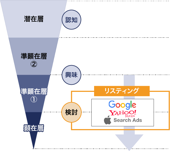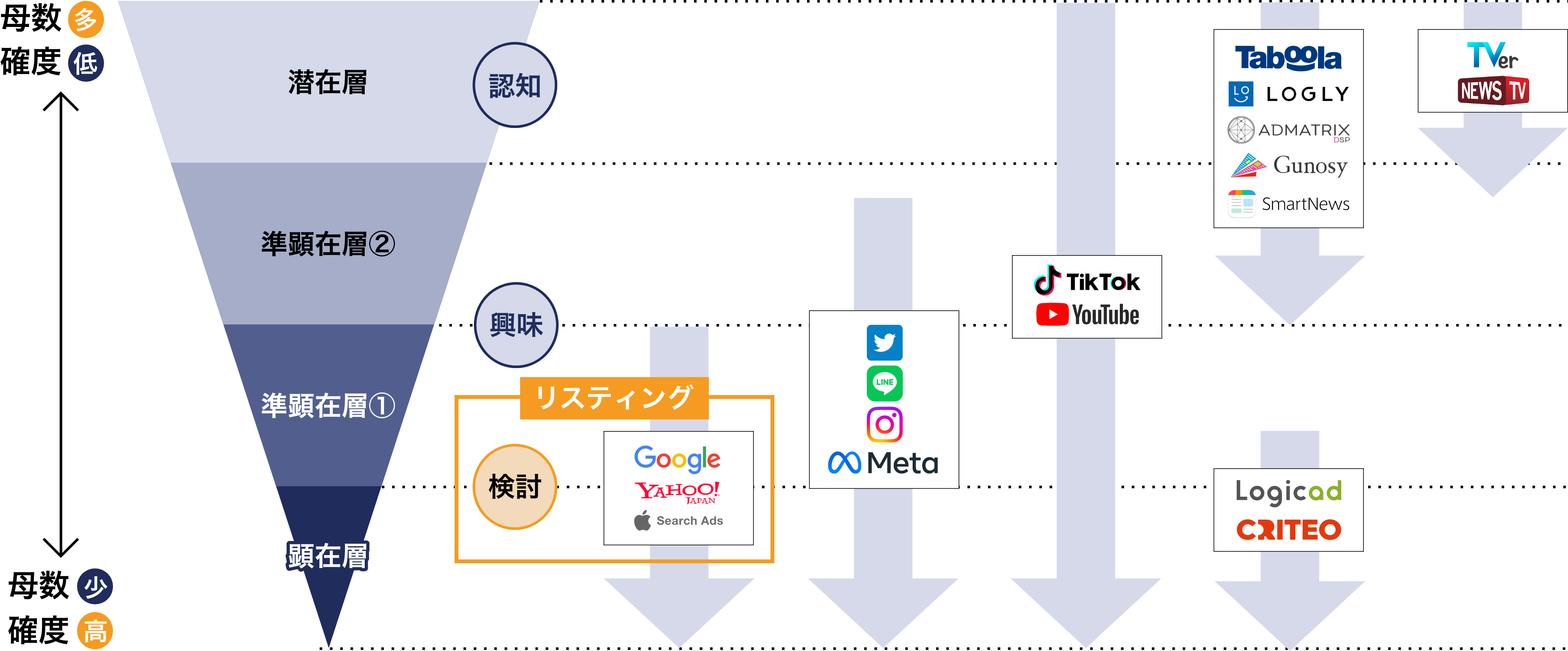 例えば、SNSを活用し潜在層へ広く認知を拡大させ、顕在化したタイミングでリスティング広告によって刈り取っていくなど、組み合わせることで効果を最大限に引き上げることが可能となります。