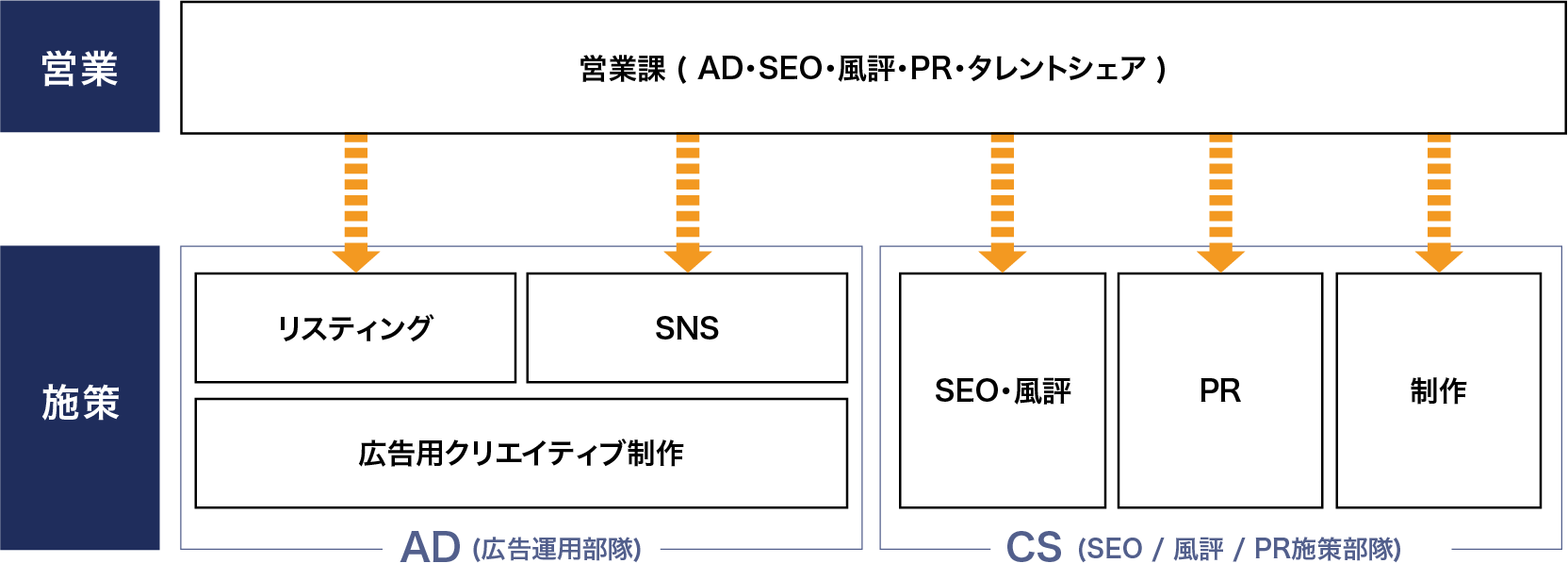 体制についても運用するだけではなく、クリエイティブ制作部とのチーム体制によりさまざまな視点で幅広いサポートが可能です。