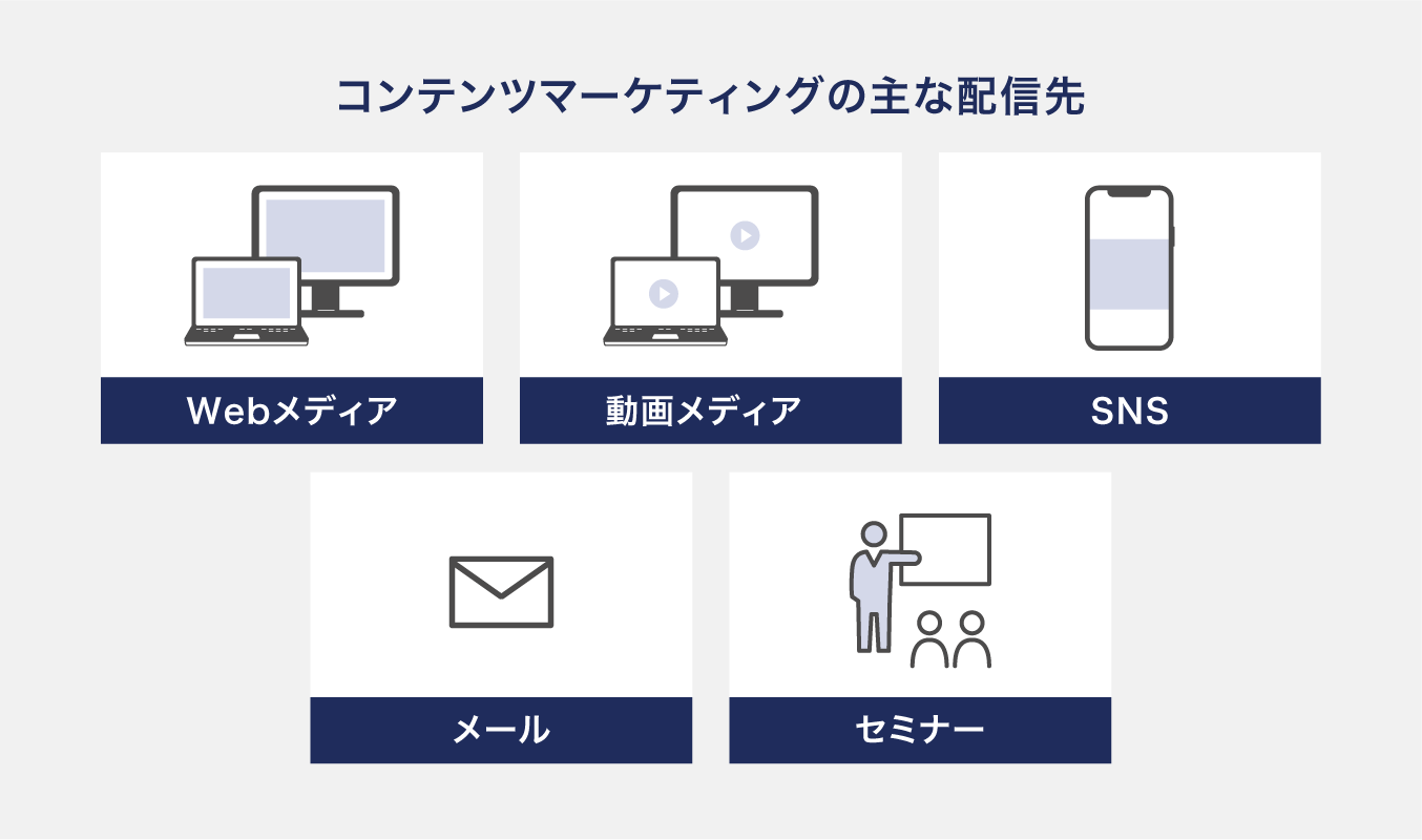 コンテンツマーケティングの配信先は、Webメディアや動画メディア、SNS、メール、セミナーなどさまざまです。